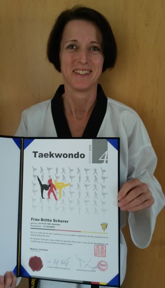 Britta überzeugte die Prüfer und erhielt ein Lob für ihre guten Leistungen. Hoch verdient erhielt sie den 4. Dan im Taekwondo.