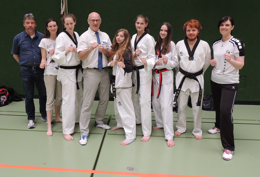 (v. l. Martin, Luna, Melanie, Enrico Simon (Taekwondo Mühlacker e. V.), Ann-Kathrin, Celina, Lara, Arian (TKD Weingarten), Marion)