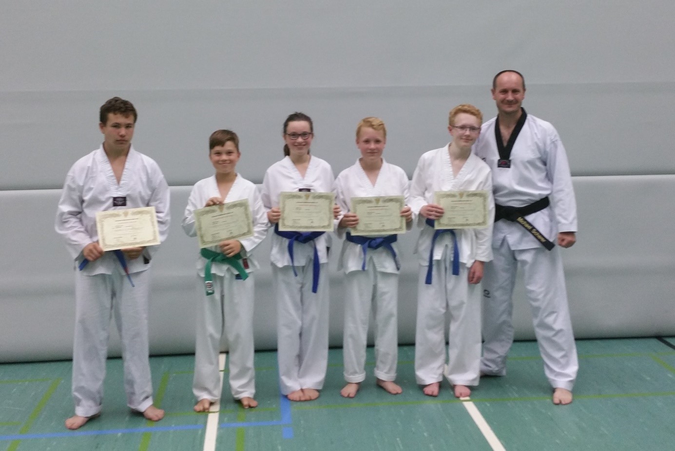 Am Freitag, den 15. und Freitag, den 22. Juli 2016, fanden beim Taekwondo Club Spöck Kup-Prüfungen (Gürtelprüfungen) statt. Insgesamt stellten sich der Herausforderung an diesen beiden Tagen 18 Taekwondo-Schüler des Vereins, wobei mit 13 Prüfungsanwärtern die Anfängergruppe die größere war. Gut vorbereitet von ihren Trainern Michael Scherer, Martin Meyritz, Melanie Rössler und Ann-Kathrin Kirsch, und trotz teilweise deutlich zu spürender Prüfungsaufregung, überzeugten die Schüler den Prüfer Michael Scherer, so dass am Ende jeder sein Prüfungsziel, den nächsthöheren Kup-Grad, erreichte.