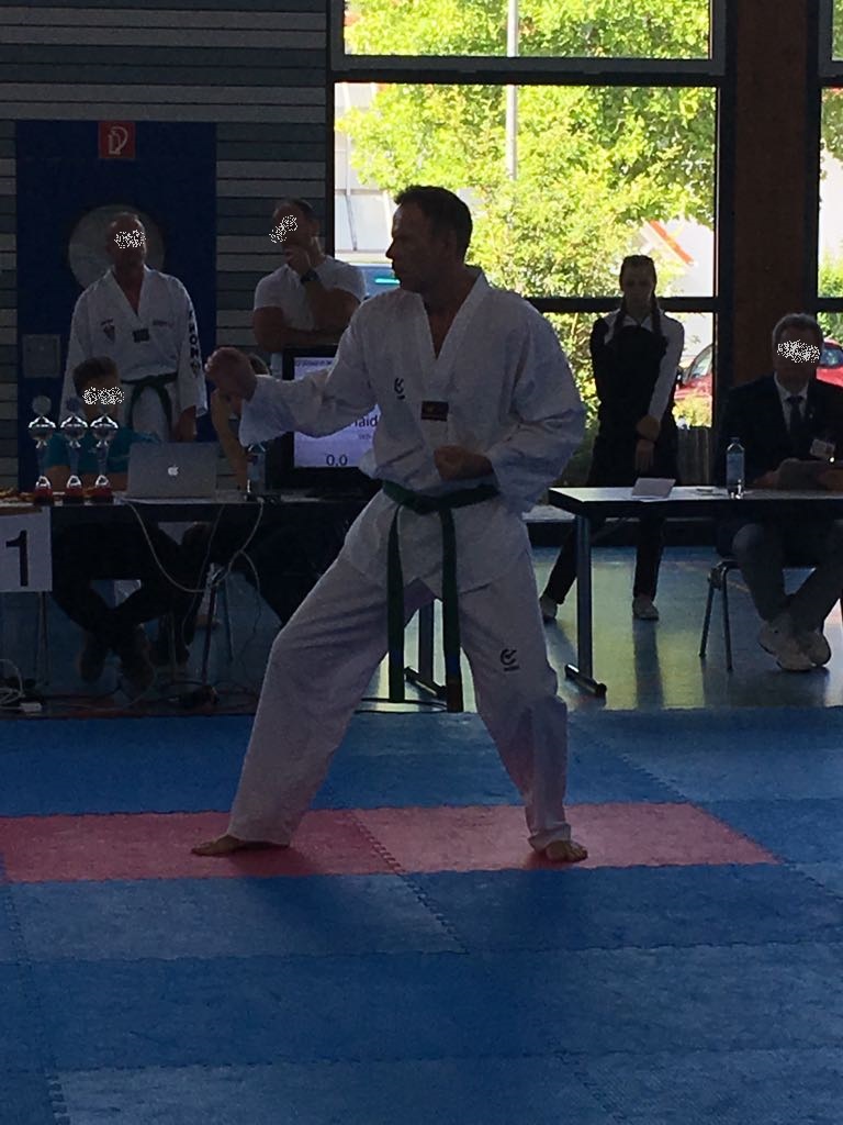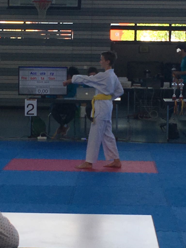 Kurz darauf startete Jelena im Einzel. Sie zeigte zwei sehr gute Formen und konnte sich auf den zweiten Platz vorkämpfen und holte verdient Silber. Zeitgleich startete Uwe und hatte anfangs auch Schwierigkeiten sich an die Umgebung zu gewöhnen. Er gab dennoch sein Bestes und holte sich den 5. Platz.