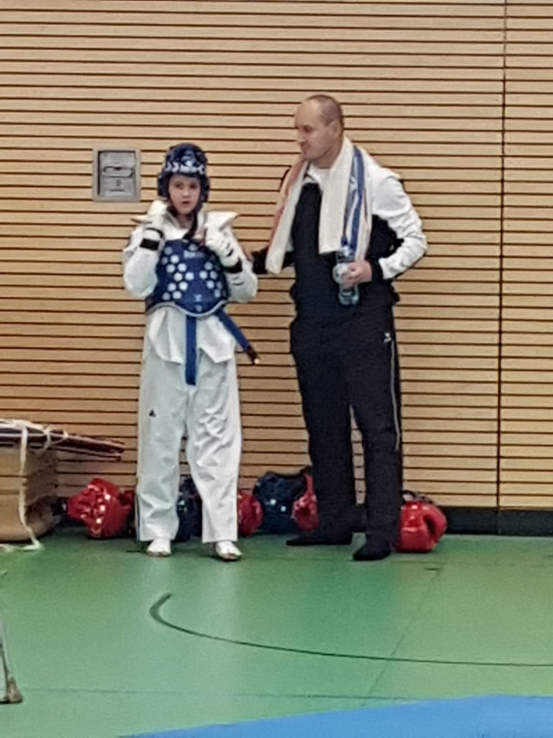 Danach machte sich Jannis bereit zum kämpfen. Er hatte einen Gegner aus Frankreich und so war die Aufregung spürbar. Gleich zu Beginn des Kampfes konnte Jannis gleich viele Kopftreffern erzielen, so dass er in der Pause schon mit 15-0 in Führung lag. Danach wurde er von seinem Coach Ann-Kathrin angehalten langsamer zu machen um seinem Gegner eine Chance zu lassen. Das tat Jannis auch, holte aber dennoch 6 Punkte und gewann durch technisches K.O. mit 21-0 Punkten. Jannis holte das erste Gold.