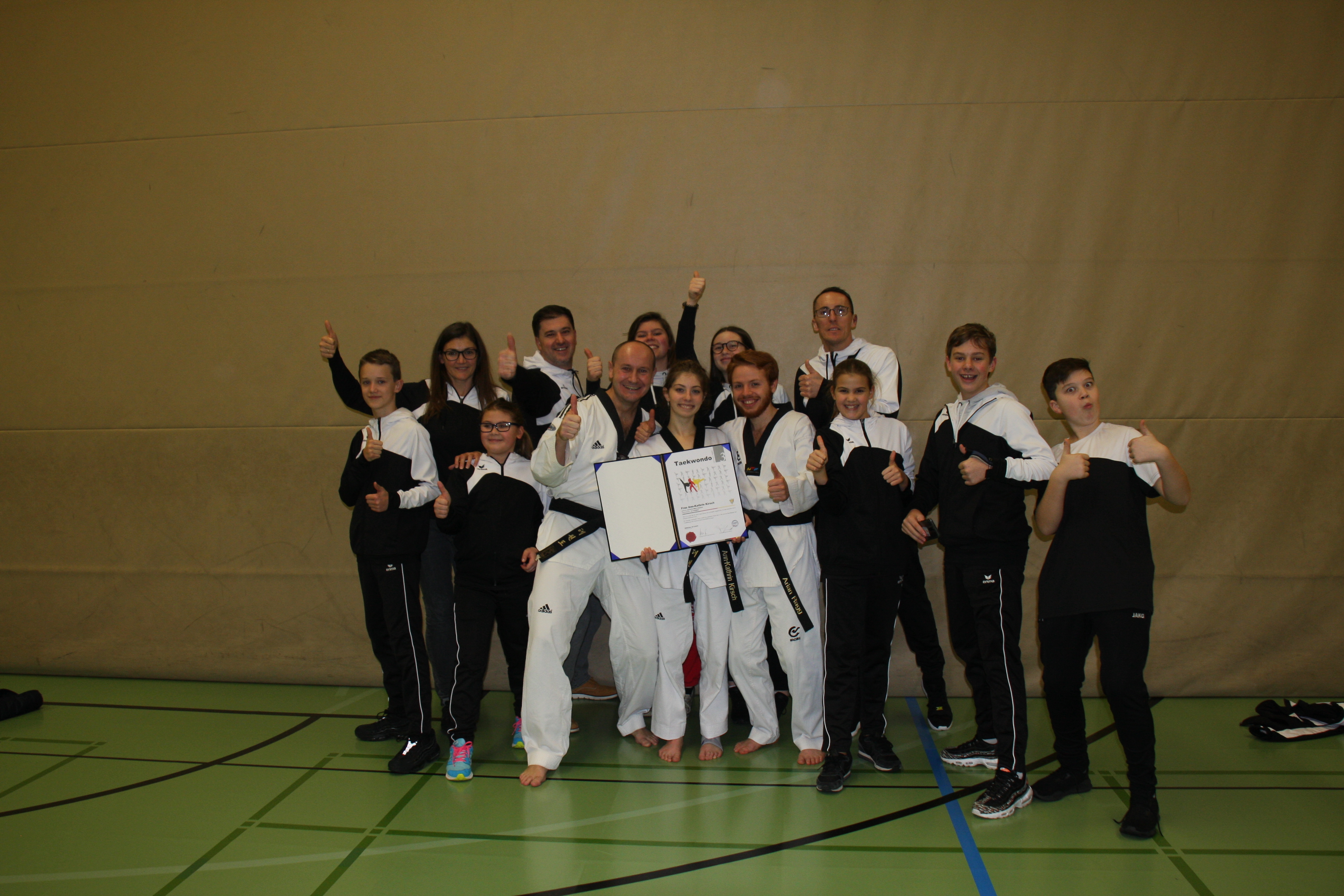 Am Sonntag, den 9. Dezember 2018, fand beim befreundeten Taekwondo Club in Mühlacker eine Landes-Dan-Prüfung für Anwärter vom 1. bis 3. Dan statt. Nach über zwei Jahren Vorbereitungszeit stellte sich Anni dieser Herausforderung. Die Prüfung zum 3. Dan im Taekwondo ist eine sehr umfangreiche Prüfung, so müssen neben den Formen die Partnerübungen (Ein-Schritt-Kampf, Selbstverteidigung und Vollkontakt-Wettkampf) mit eigenen Partnern durchgeführt werden. Vor allem die Selbstverteidigung sollte einstudiert sein, so dass nicht nur der Prüfling sondern auch seine Partner vorbereitet werden müssen. Eine sehr große Hürde stellt jedoch das Prüfungsfach "Bruchtest" dar, denn zum 3. Dan müssen eine 3er-Kombination und zwei Sprungtechniken gezeigt werden.