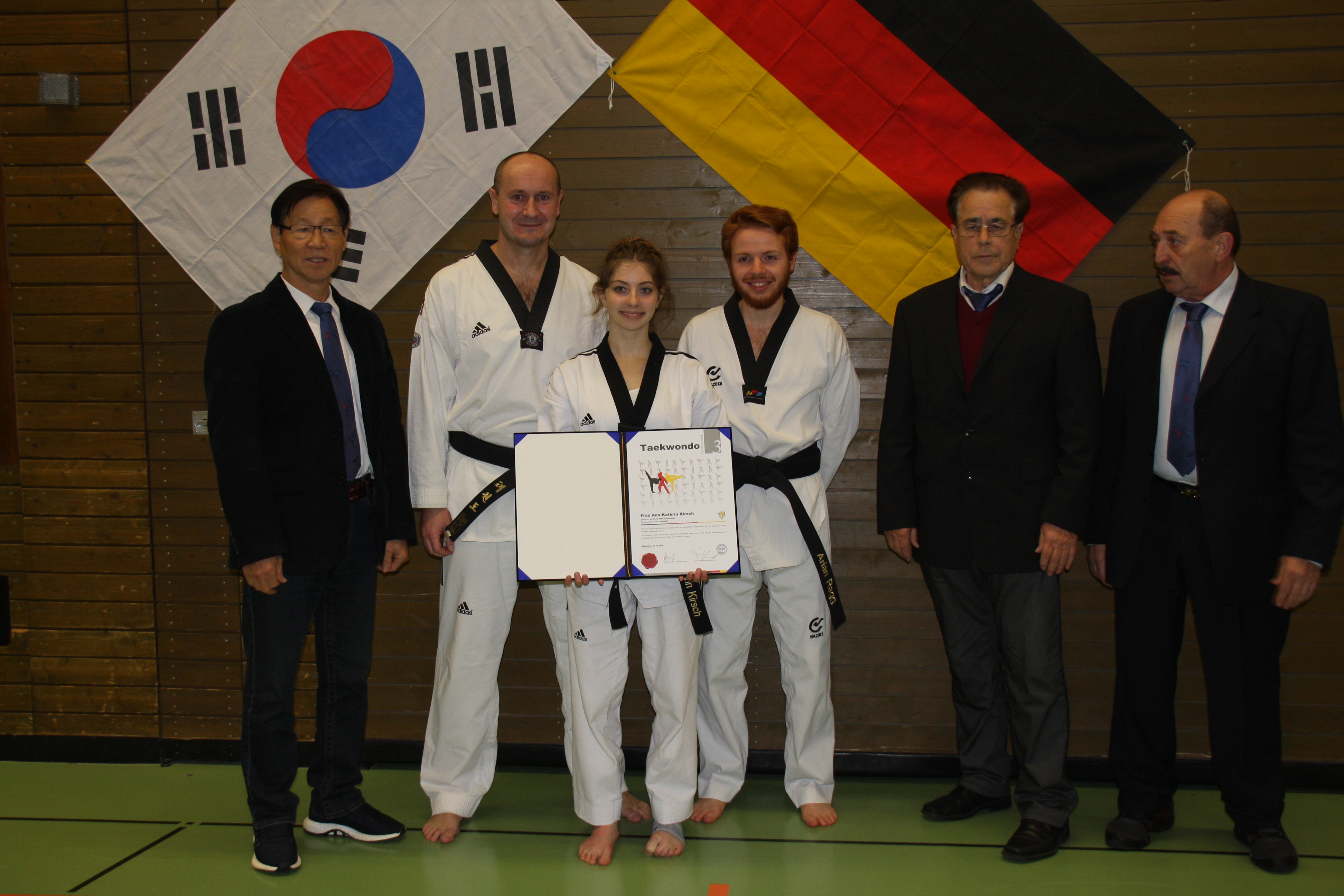 Anni überzeugte in allen Prüfungsdisziplinen und für ihr Selbstverteidigungsprogramm erntete sie sogar den Applaus der Zuschauer. Selbst die Bruchtests meisterte Anni souverän und überzeugte die drei Prüfer (Herr Kwak 9. Dan, Herr Brückel, 9. Dan und Herr Creti 8. Dan).