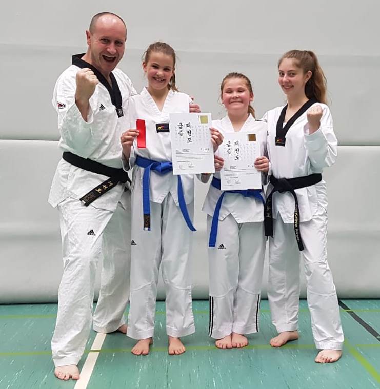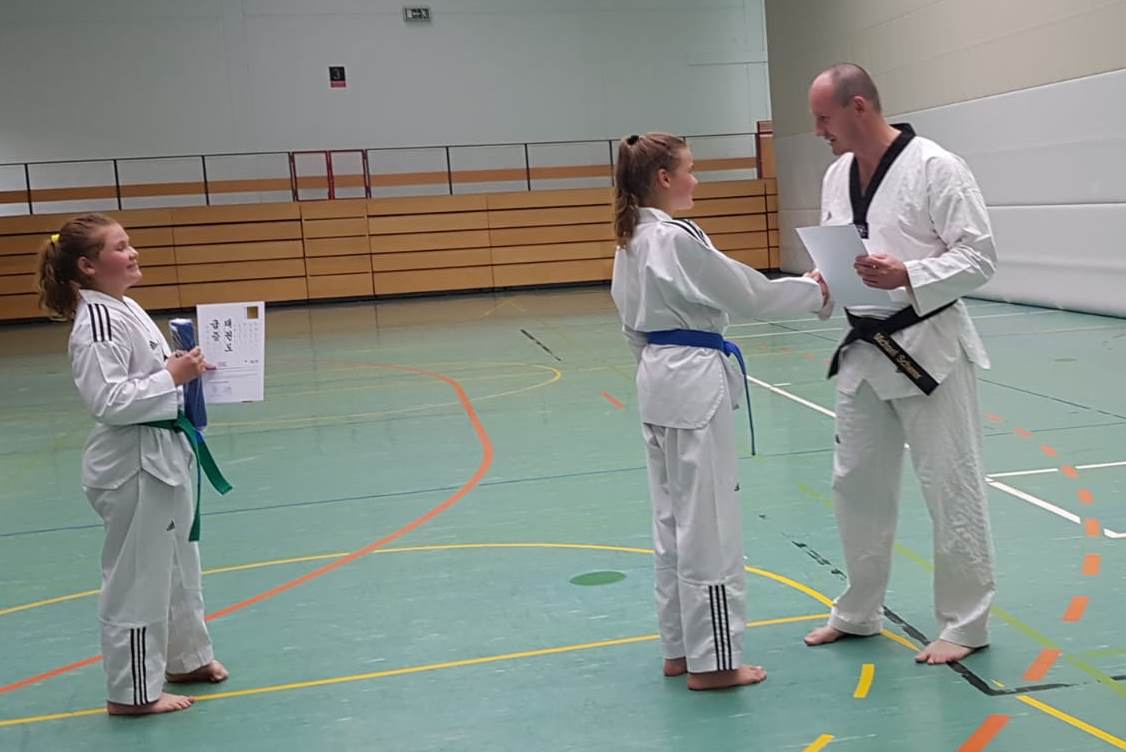 In der ersten Gruppe stellten sich Leonarda und Leticia den Anforderungen für den nächsten Kup-Grad unter den Augen des Prüfers Michael Scherer. Beide meisterten die erforderlichen Prüfungsdisziplinen: Überprüfung, Form, Einschrittkampf, Selbstverteidigung und Wettkampf, so dass sie hoch verdient, den nächsten Kup erreichten.