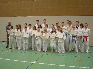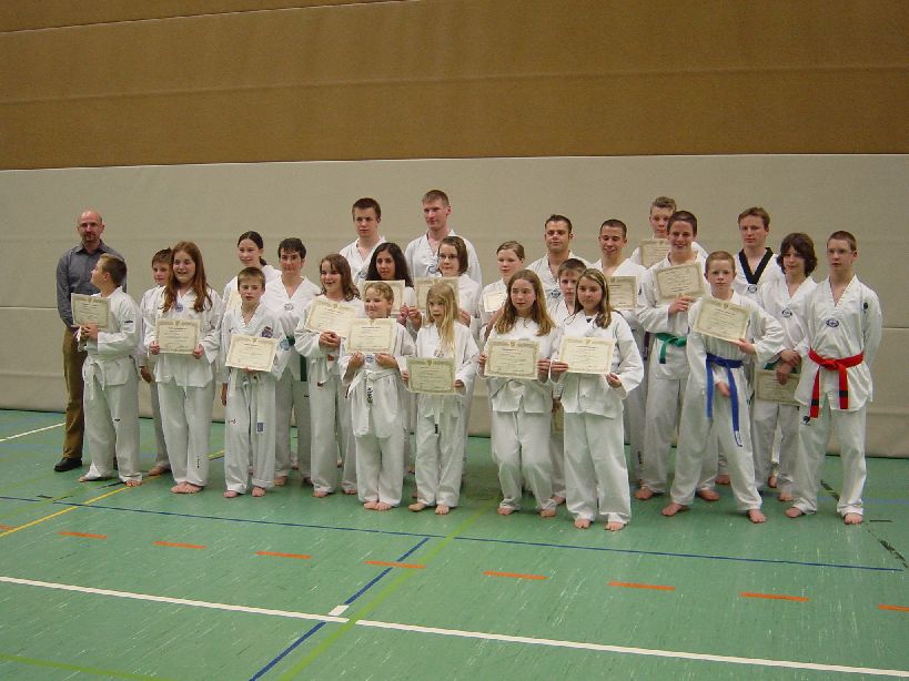 Kupprüfung am 14.05.2004 Am Freitag, den 14. Mai fand unsere erste Gürtelprüfung in diesem Jahr statt. Insgesamt 23 Taekwondoin hatten sich auf dieses Ereignis sorgfältig vorbereitet, um ihren nächst höheren Kup-Grad zu erhalten. Die Weißgurte kamen als erste dran und so prüfte Klaus-Dieter Raab aus Hambrücken gruppenweise über die Gelb-, Grün-, Blau- bis zu den Rotgurten. Alle Prüflinge konnten den Prüfer von Ihrem Können überzeugen, so dass alle die Prüfung bestanden.