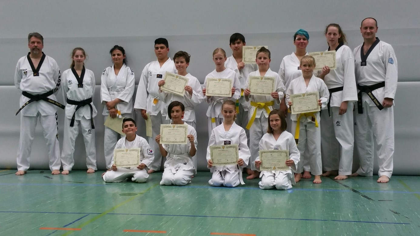 Am Freitag, den 15. und Freitag, den 22. Juli 2016, fanden beim Taekwondo Club Spöck Kup-Prüfungen (Gürtelprüfungen) statt. Insgesamt stellten sich der Herausforderung an diesen beiden Tagen 18 Taekwondo-Schüler des Vereins, wobei mit 13 Prüfungsanwärtern die Anfängergruppe die größere war. Gut vorbereitet von ihren Trainern Michael Scherer, Martin Meyritz, Melanie Rössler und Ann-Kathrin Kirsch, und trotz teilweise deutlich zu spürender Prüfungsaufregung, überzeugten die Schüler den Prüfer Michael Scherer, so dass am Ende jeder sein Prüfungsziel, den nächsthöheren Kup-Grad, erreichte.