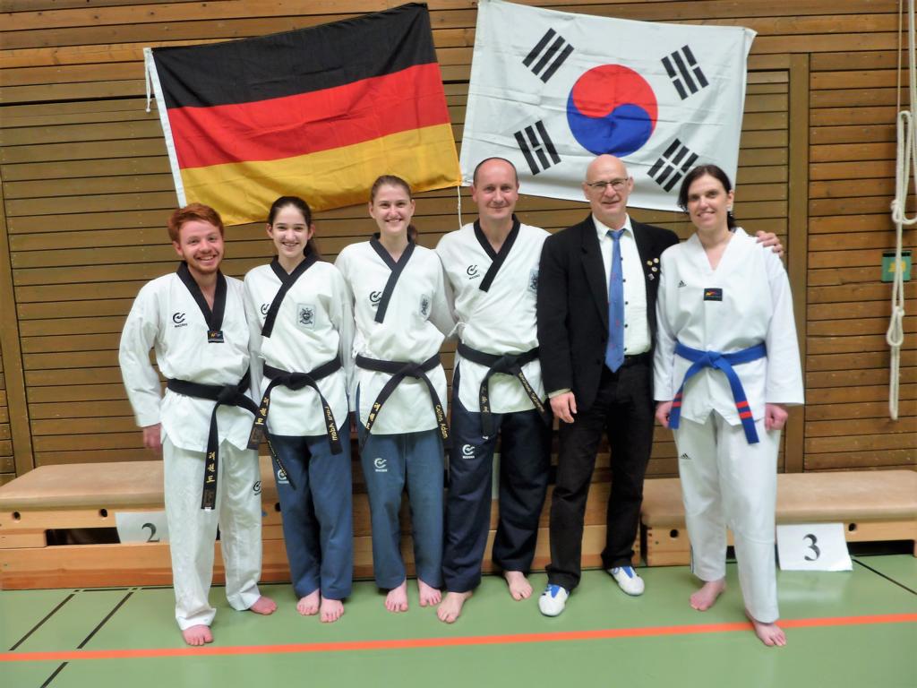 (v. l. Arian Ragg, Lara Adam, Celina Adam, Michael Scherer, Enrico Simon (TKD Mühlacker), Marion Adam)