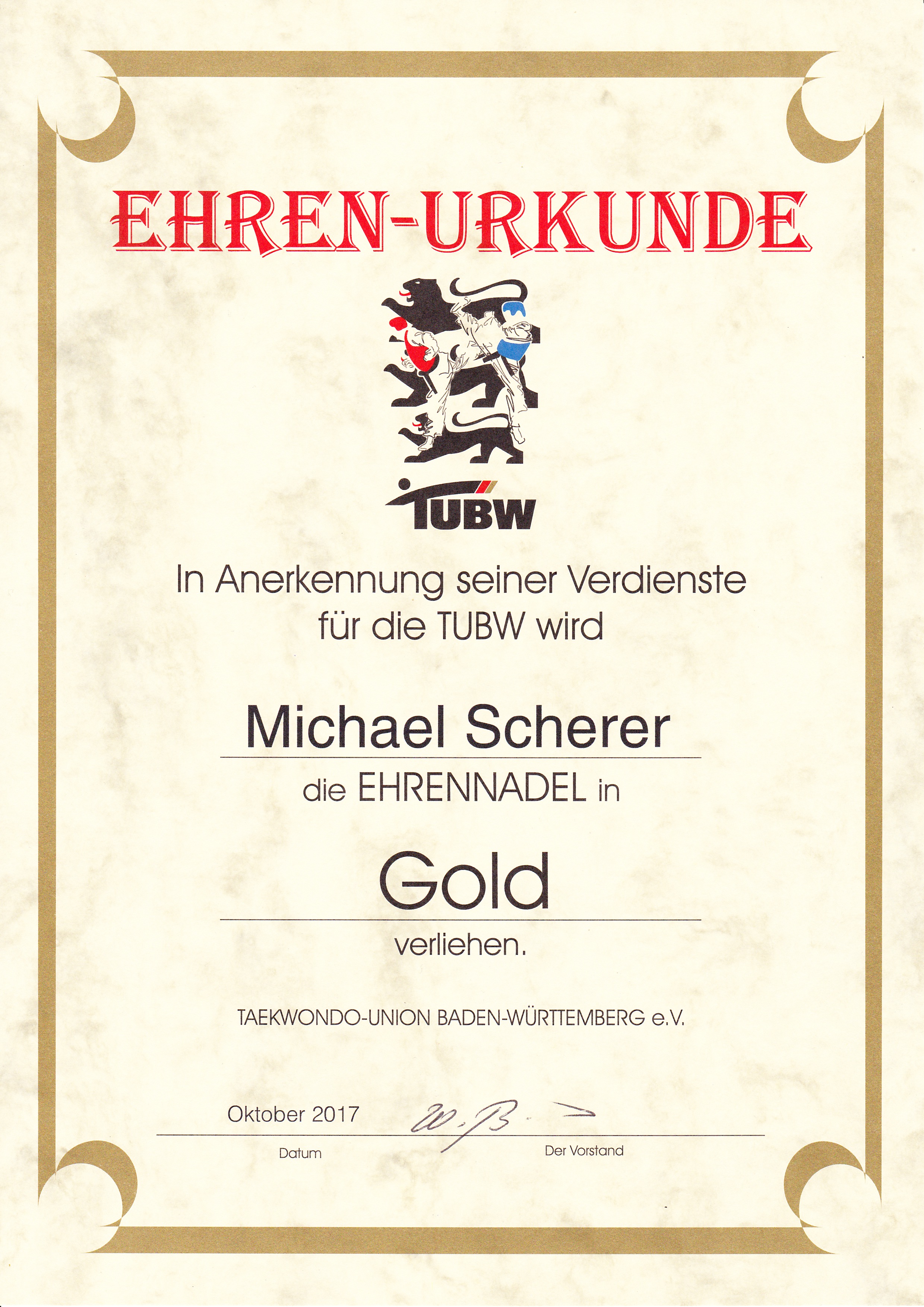 Michael Scherer ist seit 1994 Trainer und seit 1996 Vorstand beim Taekwondo Club Spöck. Michael wurde auf Vorschlag durch den Verein auf den Baden-Württembergischen Poomsae-Meisterschaften am 15.10.2017 in Berglen von der TUBW die Ehrennadel in Gold verliehen.