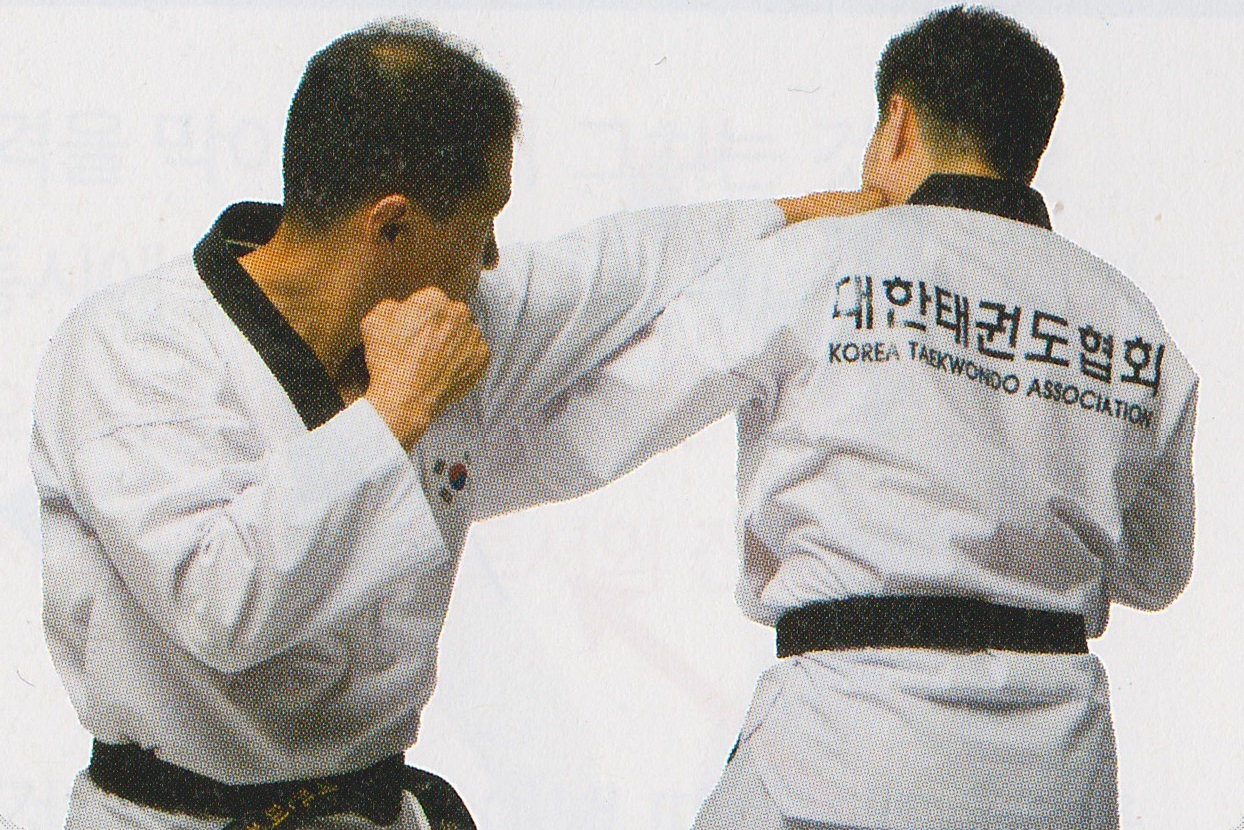 (Großmeister Jaeyeong Um bei der praktischen Anwendung eine Poomsae-Technik)