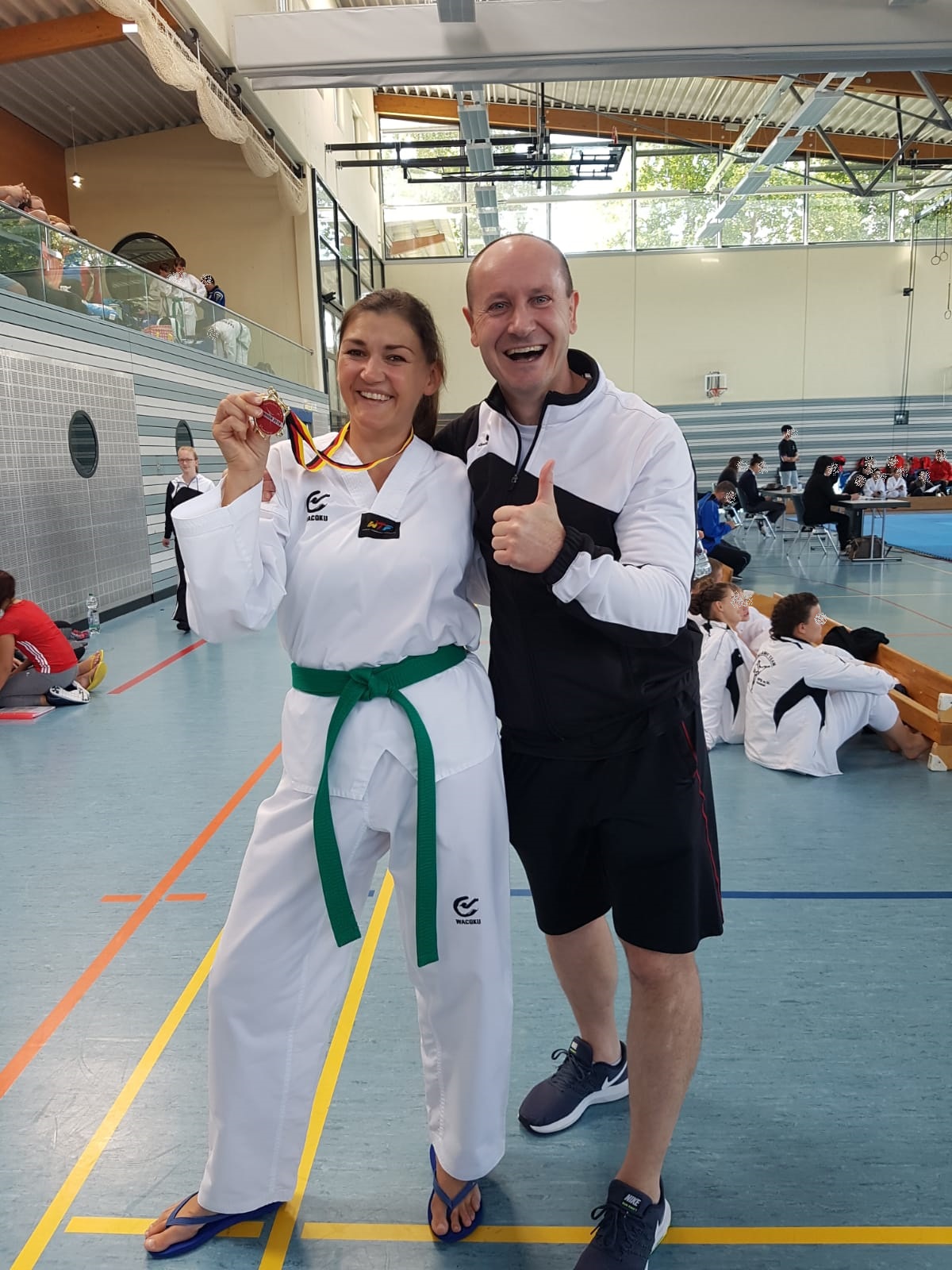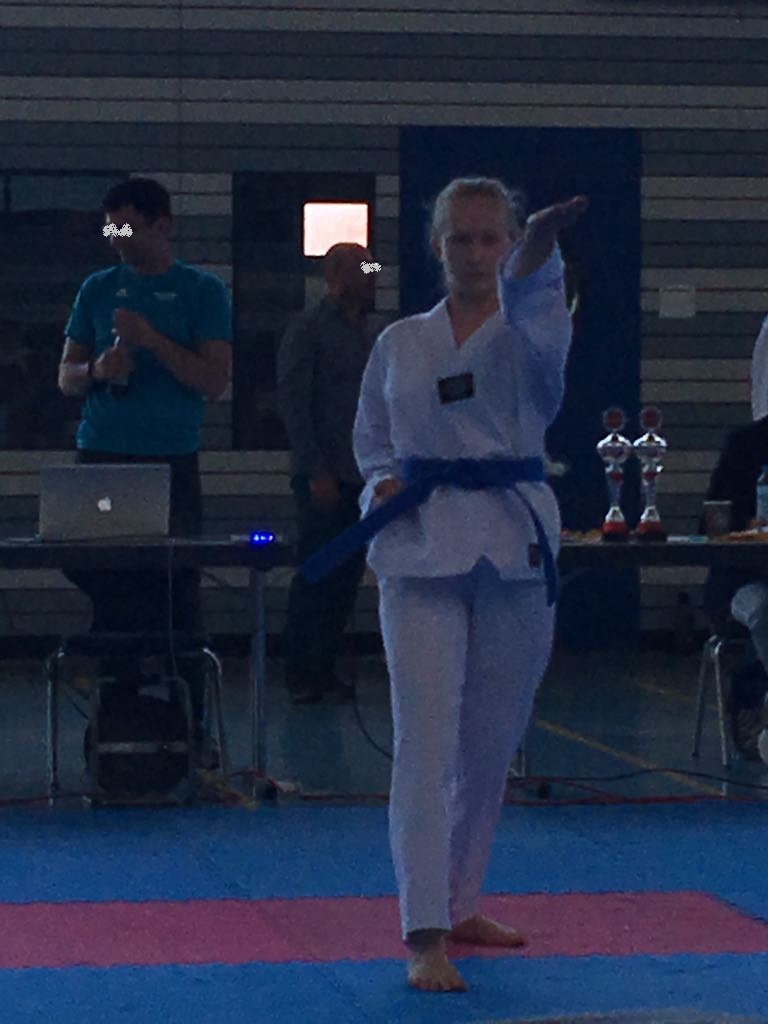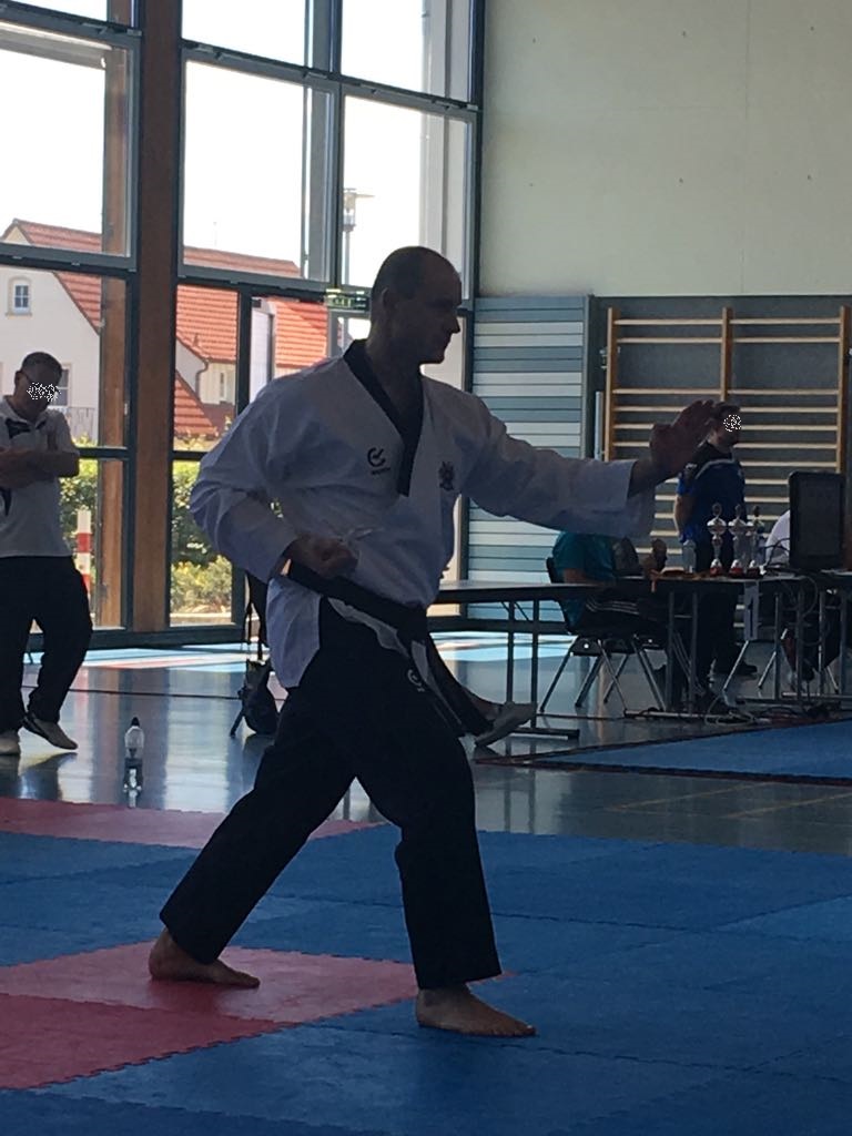 Kurz darauf startete Jelena im Einzel. Sie zeigte zwei sehr gute Formen und konnte sich auf den zweiten Platz vorkämpfen und holte verdient Silber. Zeitgleich startete Uwe und hatte anfangs auch Schwierigkeiten sich an die Umgebung zu gewöhnen. Er gab dennoch sein Bestes und holte sich den 5. Platz.