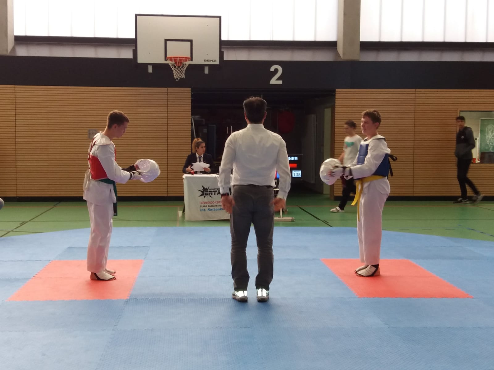 Als letztes gingen Benjamin und Ben an den Start. Da keiner von beiden in seiner Gewichtsklasse keinen Gegner hatte wurde nach Absprache mit dem Kampfgericht ein Kampf der beiden gegeneinander ausgetragen. Sie zeigten einen spektakulären Showkampf mit vielen Drehkicks und gesprungenen Kicks. Die Zuschauer fanden es sehr amüsant. Die Platzierung spielte für die beiden keine Rolle. Dennoch holte Ben den ersten Platz und Benjamin den zweiten Platz.