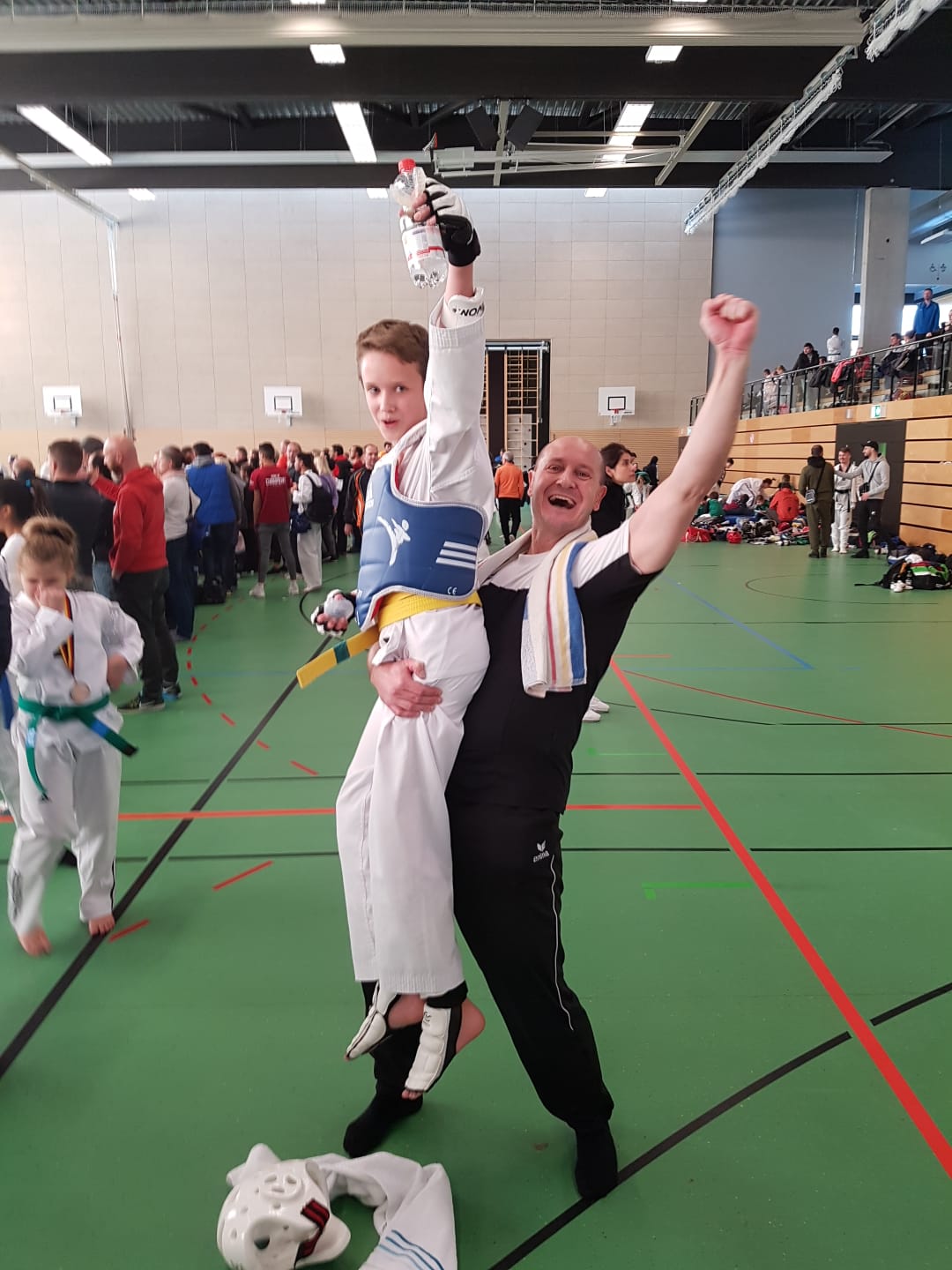 Danach machte sich Jannis bereit zum kämpfen. Er hatte einen Gegner aus Frankreich und so war die Aufregung spürbar. Gleich zu Beginn des Kampfes konnte Jannis gleich viele Kopftreffern erzielen, so dass er in der Pause schon mit 15-0 in Führung lag. Danach wurde er von seinem Coach Ann-Kathrin angehalten langsamer zu machen um seinem Gegner eine Chance zu lassen. Das tat Jannis auch, holte aber dennoch 6 Punkte und gewann durch technisches K.O. mit 21-0 Punkten. Jannis holte das erste Gold.