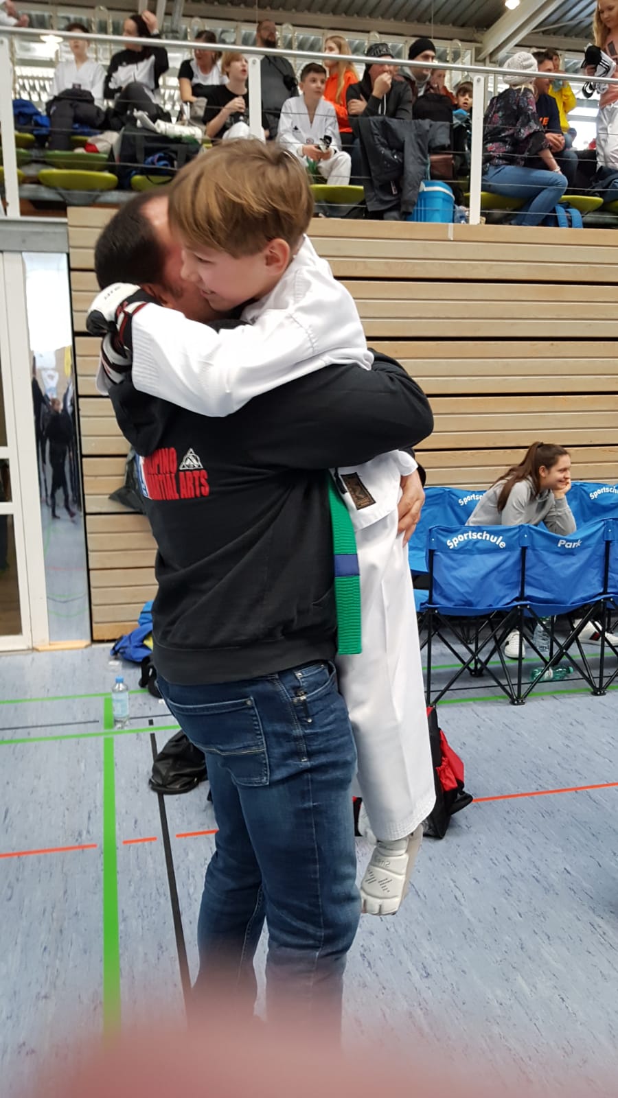 Zeitgleich Kämpfte sein Bruder Sören seinen zweiten Kampf. Sören hatte hier einen gleich starken Gegner. Der Ausgang war bis zum Ende ungewiss. Sören landete in den letzten Sekunden einen Kopftreffer und jeder war sich sicher, dass ist der Sieg. Leider landete der Gegner in der letzten Sekunde noch einen Westentreffer und gewann den Kampf. Dennoch holte unser Champ hochverdient den dritten Platz.