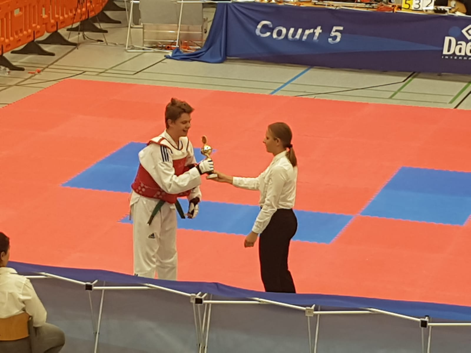 Ben war gleich im Finale. Er hatte einen Punktevorsprung der gegen Ende des Kampfes immer geringer wurde, aber er konnte den Kampf für sich entscheiden und sicherte sich den 1. Platz.