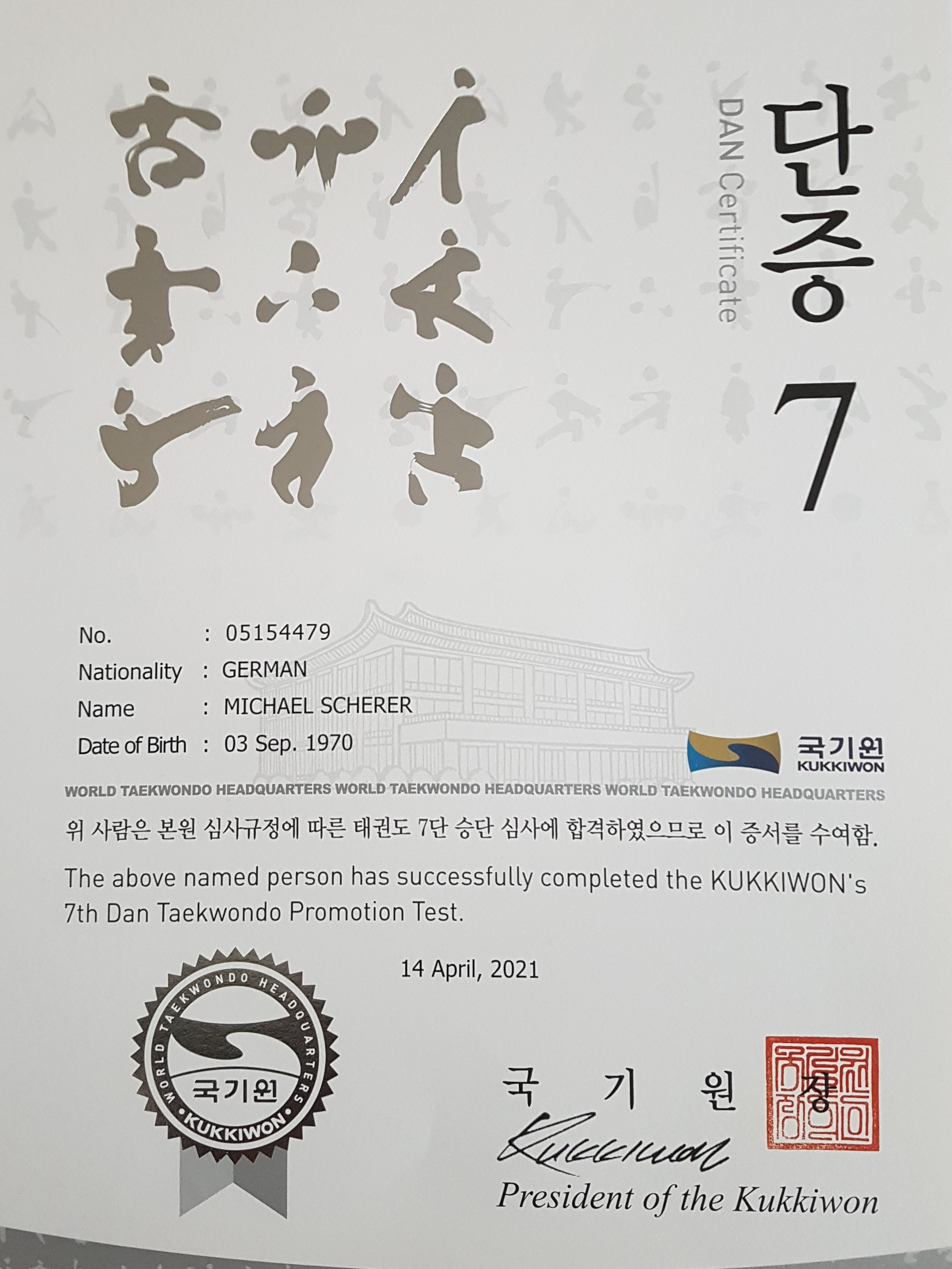 Bereits im Jahr 2016 absolvierte Michael Scherer erfolgreich die Prüfung zum 7. Dan bei einer Prüfung der Deutschen Taekwondo Union. Nun wollte sich Michael diesen Dangrad vom Kukkiwon in Seoul (Süd-Korea) bestätigen lassen, damit die Graduierung weltweit anerkannt wird.