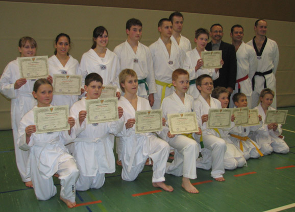 Am Freitag, dem 8.12.2006, fand die zweite Taekwondo-Gürtelprüfung in diesem Jahr statt. Insgesamt stellten 16 Prüflinge dieser Herausforderung. Für die acht Teilnehmer des Anfängerkurses war dies ihre erste Prüfung. Prüfer Heribert Helfer überzeugte sich vom Können der Prüflinge, die Grundschule, Formen, Ein- bzw. Drei-Schrittkampf, Selbstverteidigung, Pratzenübungen, Freikampf und Bruchtest zum Besten gaben. Die Trainer Michael Scherer und Jochen Kemm waren ebenfalls mit den gezeigten Leistungen ihrer Taekwondoins zufrieden und freuten sich, dass alle ihr Ziel erreichen konnten. Hier die Ergebnisse im Einzelnen.